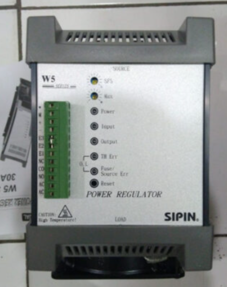 Sipin 3-Wire 3-Phase Angle Controller (SCR Power Regulator); Main Power Voltage: 200-480 Vac; Normal Rated Current: 30 Amps; Auxiliary Power Source Code: 220 Vac; Input Signal Code: 4 to 20 mA; Buffering Time Code: Adjustable 1 to 22 Seconds.