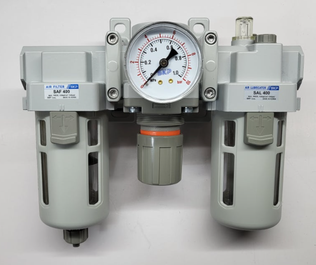 Bộ lọc khí nén SKP SAU400-04 được cấu tạo thành bởi bộ ba bao gồm: SAF400-04 (lọc khí) + SAR400-04 (Bộ điều áp) +SAL400-04 (Bộ cung cấp dầu) có model như sau: